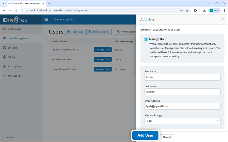 Yes. As a reseller, you can create managed customer accounts by selecting the 'Manage User' option while adding users to your IDrive® e2 reseller account. This setup lets you allocate storage, manage permissions, and retain full control over the accounts. You can also generate access keys and secret keys to provide secure customer access, ensuring complete administrative oversight and safeguarding sensitive account information.