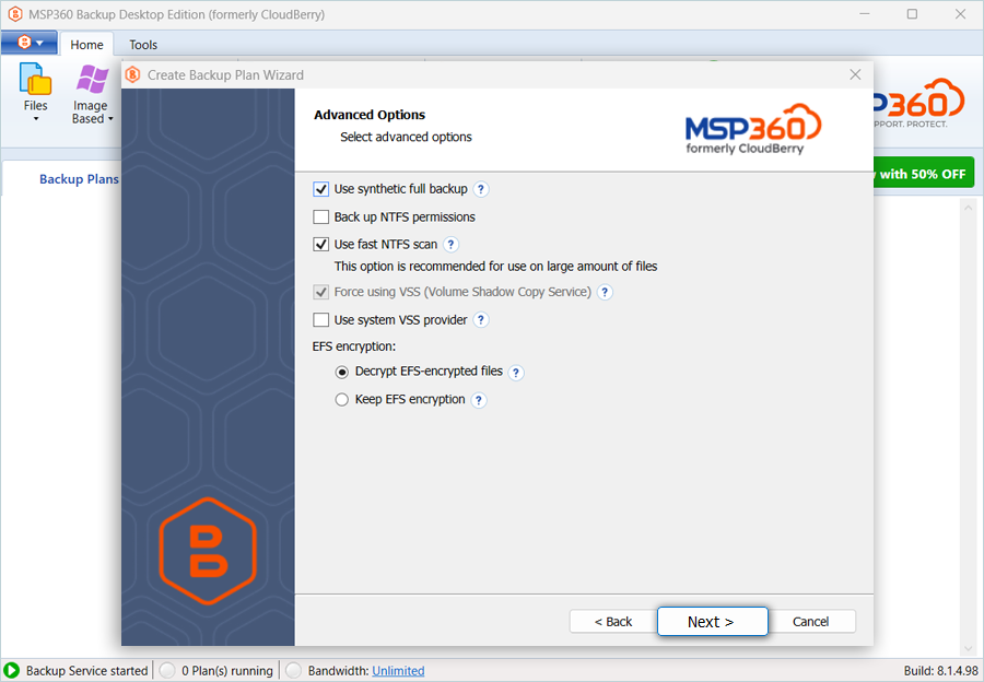 - Select/deselect the Compression and Encryption Options checkboxes according to your requirements, then click Next.