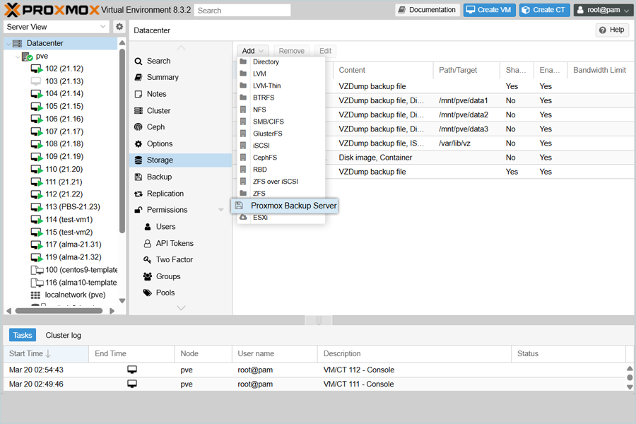 - Click Add and select Proxmox Backup Server from the list to add a new data center.