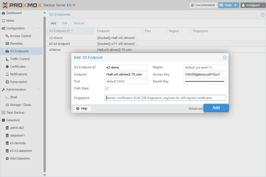 - Select S3 Endpoints under Configuration and then click Add to add your IDrive e2 cloud as a new S3 Endpoint.